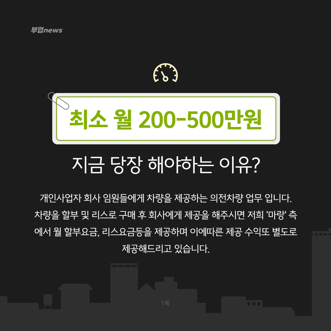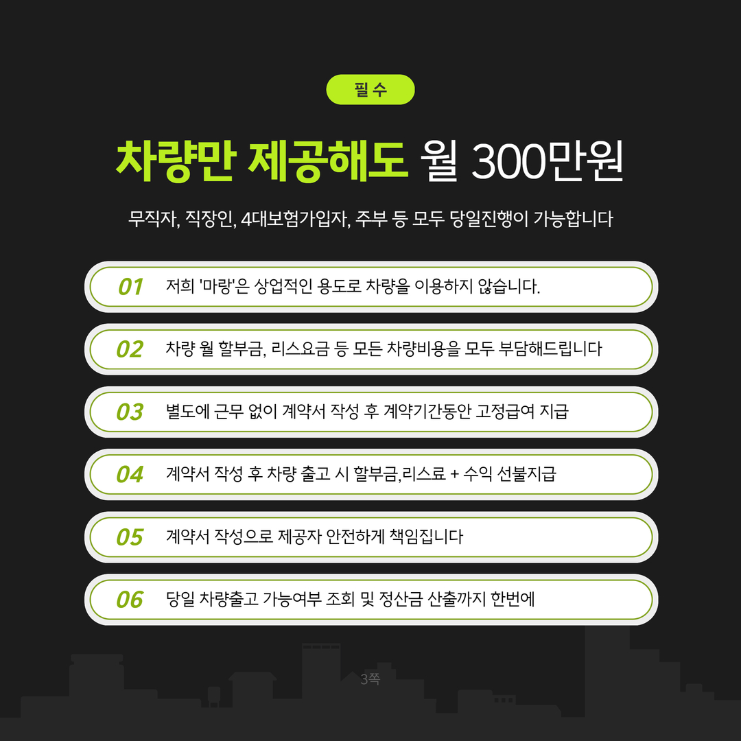 의전차량 제공 업무로 개인사업자 회사 임원들에게 차량을 제공하는 업무 입니다. 별도에 업무 및 시간을 들일 필요 없이 당장 모아둔 돈이 없더라도 중고차, 신차 등을 할부/리스 를 통해 구입 후 '마랑' 회사에 제공하는 업무 입니다. 1인당 1회